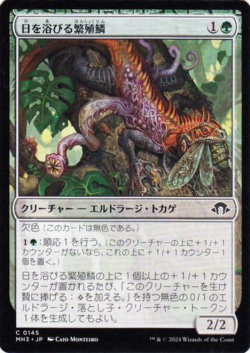 ![]() ![]() | MH3 0145 日を浴びる繁殖鱗 クリーチャー モダンホライゾン3 C 色:緑 サブタイプ:エルドラージ・トカゲ マナコスト:(1)(緑) パワー:2 タフネス:2 欠色(このカードは無色である。) (1)(緑):順応1を行う。(このクリーチャーの上に+1/+1カウンターがないなら、これの上に+1/+1カウンター1個を置く。) 日を浴びる繁殖鱗の上に1個以上の+1/+1カウンターが置かれるたび、「このクリーチャーを生け贄に捧げる:(無)を加える。」を持つ無色の0/1のエルドラージ・落とし子・クリーチャー・トークン1体を生成してもよい。 illust:CAIO MONTEIRO |