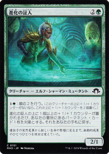 ![]() ![]() | MH3 0151 進化の証人 クリーチャー モダンホライゾン3 C 色:緑 サブタイプ:エルフ・シャーマン・ミュータント マナコスト:(2)(緑) パワー:2 タフネス:1 (1)(緑):順応2を行う。(このクリーチャーの上に+1/+1カウンターがないなら、これの上に+1/+1カウンターを2個置く。) 進化の証人の上に1個以上の+1/+1カウンターが置かれるたび、あなたの墓地にあるパーマネント・カード1枚を対象とする。それをあなたの手札に戻す。 遺伝子の突然変異から新しい生命の繁殖に至るまで、画期的成果のひとつひとつを彼女は覚えていた。 illust:NEREIDA |