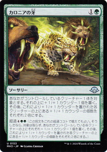 ![]() ![]() | MH3 0153 カロニアの牙 ソーサリー モダンホライゾン3 U 色:緑 マナコスト:(1)(緑) あなたがコントロールしているクリーチャー1体を対象とする。それの上に+1/+1カウンター1個を置く。その後、これにより+1/+1カウンターを置かれた各クリーチャーの上にある+1/+1カウンターの個数をそれぞれ2倍にする。 超過(4)(緑)(緑)(この呪文をこれの超過コストで唱えてもよい。そうしたなら、対象は取らず、あなたがコントロールしている各クリーチャーの上にそれぞれ+1/+1カウンター1個を置く。その後、これにより+1/+1カウンターを置かれた各クリーチャーの上にある+1/+1カウンターの個数をそれぞれ2倍にする。) illust:LEANNA CROSSAN |