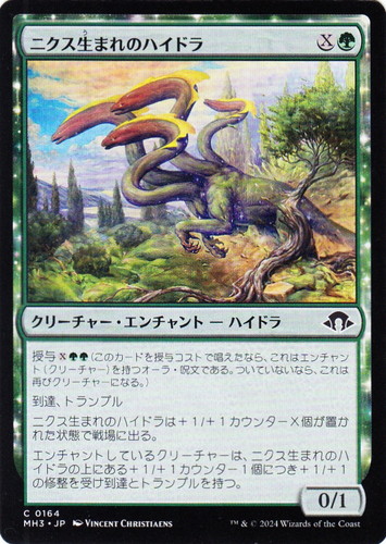 ![]() ![]() | MH3 0164 ニクス生まれのハイドラ クリーチャー・エンチャント モダンホライゾン3 C 色:緑 サブタイプ:ハイドラ マナコスト:(X)(緑) パワー:0 タフネス:1 授与(X)(緑)(緑)(このカードを授与コストで唱えたなら、これはエンチャント(クリーチャー)を持つオーラ・呪文である。ついていないなら、これは再びクリーチャーになる。 到達、トランプル ニクス生まれのハイドラは+1/+1カウンターX個が置かれた状態で戦場に出る。 エンチャントしているクリーチャーは、ニクス生まれのハイドラの上にある+1/+1カウンター1個につき+1/+1の修整を受け、到達とトランプルを持つ。 illust:VINCENT CHRISTIAENS |