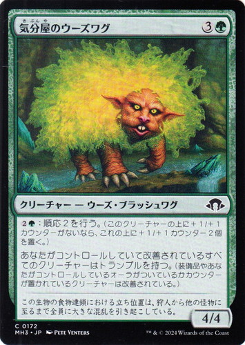 ![]() ![]() | MH3 0172 気分屋のウーズワグ クリーチャー モダンホライゾン3 C 色:緑 サブタイプ:ウーズ・ブラッシュワグ マナコスト:(3)(緑) パワー:4 タフネス:4 (2)(緑):順応2を行う。(このクリーチャーの上に+1/+1カウンターがないなら、これの上に+1/+1カウンター2個を置く。) あなたがコントロールしていて改善されているすべてのクリーチャーはトランプルを持つ。(装備品やあなたがコントロールしているオーラがついているかカウンターが置かれているクリーチャーは改善されている。) この生物の食物連鎖における立ち位置は、狩人から他の怪物に至るまで全員に大きな混乱を引き起こしている。 illust:PETE VENTERS |