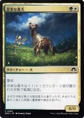![]() ![]() | MH3 0185 忠実な番犬 クリーチャー モダンホライゾン3 C 色:緑/白 サブタイプ:犬 マナコスト:(緑)(白) パワー:0 タフネス:0 警戒 忠実な番犬は+1/+1カウンター3個が置かれた状態で戦場に出る。 正式な呼称は第三大隊巡視犬七番だったが、兵士たちは新たに向かえた同僚に麗脚卿の爵位を授けた。 illust:SAMUEL PERIN |