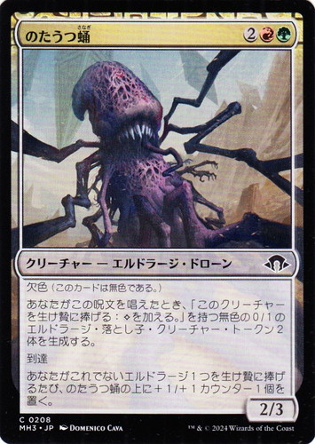 ![]() ![]() | MH3 0208 のたうつ蛹 クリーチャー モダンホライゾン3 C 色:赤/緑 サブタイプ:エルドラージ・ドローン マナコスト:(2)(赤)(緑) パワー:2 タフネス:3 欠色(このカードは無色である。) あなたがこの呪文を唱えたとき、「このクリーチャーを生け贄に捧げる:(無)を加える。」を持つ無色の0/1のエルドラージ・落とし子・クリーチャー・トークン2体を生成する。 到達 あなたがこれでないエルドラージ1つを生け贄に捧げるたび、のたうつ蛹の上に+1/+1カウンター1個を置く。 illust:DOMENICO CAVA |
