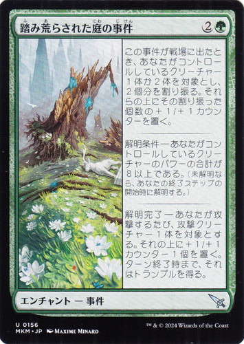 ![]() ![]() | MKM 0156 踏み荒らされた庭の事件 エンチャント カルロフ邸殺人事件 U 色:緑 サブタイプ:事件 マナコスト:(2)(緑) この事件が戦場に出たとき、あなたがコントロールしているクリーチャー1体か2体を対象とし、2個分を割り振る。それらの上にその割り振った個数の+1/+1カウンターを置く。 解明条件―あなたがコントロールしているクリーチャーのパワーの合計が8以上である。(未解明なら、あなたの終了ステップの開始時に解明する。) 解明完了―あなたが攻撃するたび、攻撃クリーチャー1体を対象とする。それの上に+1/+1カウンター1個を置く。ターン終了時まで、それはトランプルを得る。 illust:MAXIME MINARD |