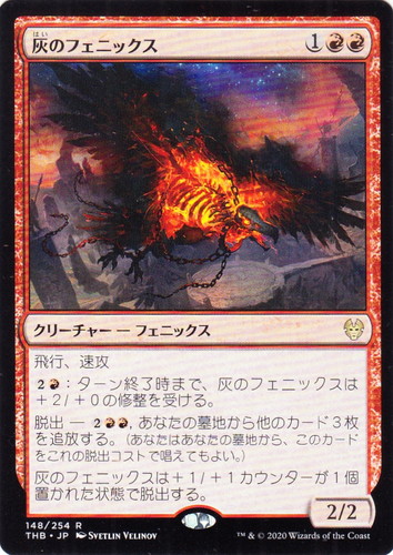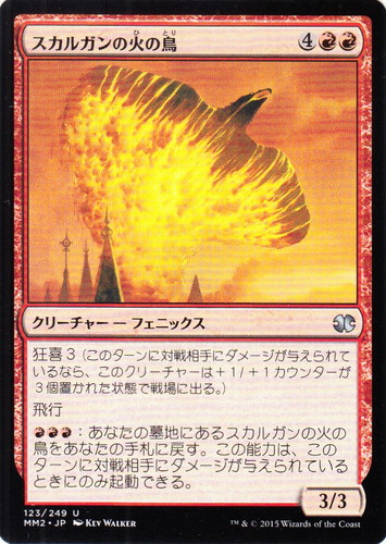 ![]() ![]() | MM2 123 スカルガンの火の鳥 クリーチャー モダンマスターズ2015 U 色:赤 サブタイプ:フェニックス マナコスト:(4)(赤)(赤) パワー:3 タフネス:3 狂喜3(このターンに対戦相手にダメージが与えられているなら、このクリーチャーは+1/+1カウンターが3個置かれた状態で戦場に出る。) 飛行 (赤)(赤)(赤):あなたの墓地にあるスカルガンの火の鳥をあなたの手札に戻す。この能力は、このターンに対戦相手にダメージが与えられているときにのみ起動できる。 illust:KEV WALKER |