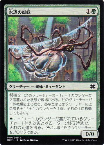 ![]() ![]() | MM2 140 水辺の蜘蛛 クリーチャー モダンマスターズ2015 C 色:緑 サブタイプ:蜘蛛・ミュータント マナコスト:(1)(緑) パワー:0 タフネス:0 移植2(このクリーチャーは+1/+1カウンターが2個置かれた状態で戦場に出る。他のクリーチャーが1体戦場に出るたび、あなたはこのクリーチャーの上にある+1/+1カウンターを1個、それの上に移動してもよい。) (緑):+1/+1カウンターが置かれているクリーチャー1体を対象とする。ターン終了時まで、それは到達を得る。(それは飛行を持つクリーチャーをブロックできる。) illust:DANY ORIZIO |