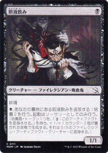 ![]() ![]() | BFZ 125 大食の虚身 クリーチャー 戦乱のゼンディカー C 色:黒 サブタイプ:ゾンビ マナコスト:(2)(黒) パワー:2 タフネス:2 (1)(黒),他のクリーチャー1体を生け贄に捧げる:大食の虚身の上に+1/+1カウンターを2個置く。この能力は、あなたがソーサリーを唱えられるときにのみ起動できる。 「グール・ドラズの虚身どもは、近頃はエサに困らぬからな。」 ――カラストリアの血の長、ドラーナ illust:KARL KOPINSKI |