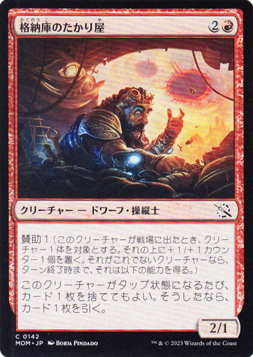![]() ![]() | MOM 0142 格納庫のたかり屋 クリーチャー 機械兵団の進軍 C 色:赤 サブタイプ:ドワーフ・操縦士 マナコスト:(2)(赤) パワー:2 タフネス:1 賛助1(このクリーチャーが戦場に出たとき、クリーチャー1体を対象とする。それの上に+1/+1カウンター1個を置く。それがこれでないクリーチャーなら、ターン終了時まで、それは以下の能力を得る。) このクリーチャーがタップ状態になるたび、カード1枚を捨ててもよい。そうしたなら、カード1枚を引く。 illust:BORIA PINDADO |