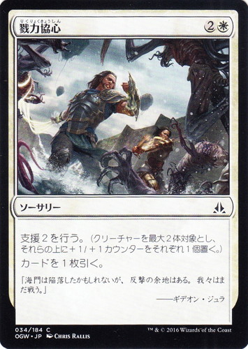 ![]() ![]() | OGW 034 戮力協心 ソーサリー ゲートウォッチの誓い C 色:白 マナコスト:(2)(白) 支援2を行う。(クリーチャー最大2体を対象とし、それらの上に+1/+1カウンターをそれぞれ1個置く。) カードを1枚引く。 「海門は陥落したかもしれないが、反撃の余地はある。我々はまだ戦う。」 ――ギデオン・ジュラ illust:CHRIS RALLIS |