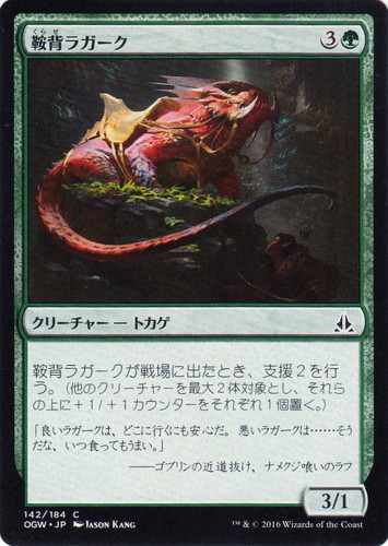 ![]() ![]() | OGW 142 鞍背ラガーク クリーチャー ゲートウォッチの誓い C 色:緑 サブタイプ:トカゲ マナコスト:(3)(緑) パワー:3 タフネス:1 鞍背ラガークが戦場に出たとき、支援2を行う。(他のクリーチャーを最大2体対象とし、それらの上に+1/+1カウンターをそれぞれ1個置く。) 「良いラガークは、どこに行くにも安心だ。悪いラガークは・・・・・・そうだな、いつ食ってもうまい。」 ――ゴブリンの近道抜け、ナメクジ喰いのラフ illust:JASON KANG |