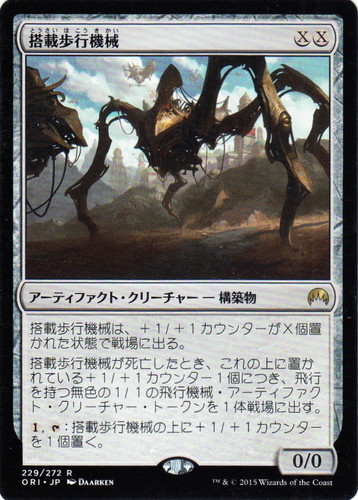 ![]() ![]() | ORI 229 搭載歩行機械 アーティファクト・クリーチャー マジック・オリジン R 色:無色 サブタイプ:構築物 マナコスト:(X)(X) パワー:0 タフネス:0 搭載歩行機械は、+1/+1カウンターがX個置かれた状態で戦場に出る。 搭載歩行機械が死亡したとき、これの上に置かれている+1/+1カウンター1個につき、飛行を持つ無色の1/1の飛行機械・アーティファクト・クリーチャー・トークンを1体戦場に出す。 (1), [T]:搭載歩行機械の上に+1/+1カウンターを1個置く。 illust:DAARKEN |