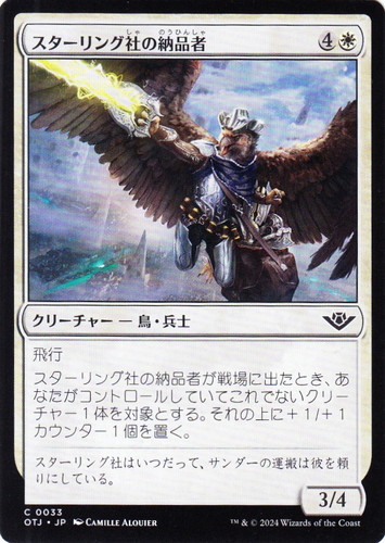![]() ![]() | OTJ 0033 スターリング社の納品者 クリーチャー サンダー・ジャンクションの無法者 C 色:白 サブタイプ:鳥・兵士 マナコスト:(4)(白) パワー:3 タフネス:4 飛行 スターリング社の納品者が戦場に出たとき、あなたがコントロールしていてこれでないクリーチャー1体を対象とする。それの上に+1/+1カウンター1個を置く。 スターリング社はいつだって、サンダーの運搬は彼を頼りにしている。 illust:CAMILLE ALOUIER |