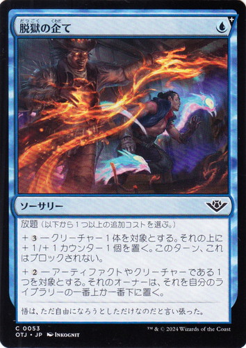 ![]() ![]() | OTJ 0053 脱獄の企て ソーサリー サンダー・ジャンクションの無法者 C 色:青 マナコスト:(青) 放題(以下から1つ以上の追加コストを選ぶ。) +(3)―クリーチャー1体を対象とする。それの上に+1/+1カウンター1個を置く。このターン、これはブロックされない。 +(2)―アーティファクトやクリーチャーである1つを対象とする。それのオーナーは、それを自分のライブラリーの一番上か一番下に置く。 悟は、ただ自由になろうとしただけなのだと言い張った。 illust:INKOGNIT |