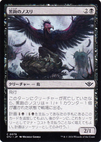 ![]() ![]() | OTJ 0079 黒鉤のノスリ クリーチャー サンダー・ジャンクションの無法者 C 色:黒 サブタイプ:鳥 マナコスト:(2)(黒) パワー:2 タフネス:1 飛行 このターンにクリーチャーが死亡していたなら、黒鉤のノスリは+1/+1カウンター1個が置かれた状態で戦場に出る。 計画(1)(黒)((1)(黒)を支払ってあなたの手札にあるこのカードを追放してもよい。後のターンに、これをソーサリーとしてマナ・コストを支払うことなく唱えてもよい。計画はソーサリーとしてのみ行う。) illust:MICHELE GIORGI |