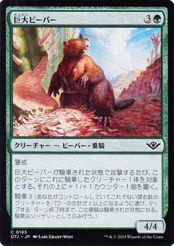 ![]() ![]() | OTJ 0165 巨大ビーバー クリーチャー サンダー・ジャンクションの無法者 C 色:緑 サブタイプ:ビーバー・乗騎 マナコスト:(3)(緑) パワー:4 タフネス:4 警戒 巨大ビーバーが騎乗された状態で攻撃するたび、このターンにこれに騎乗したクリーチャー1体を対象とする。それの上に+1/+1カウンター1個を置く。 騎乗3(あなたがコントロールしていてこれでない望む数のクリーチャーをパワーの合計が3以上になるように選び、タップする:ターン終了時まで、この乗騎は騎乗された状態になる。騎乗はソーサリーとしてのみ行う。) illust:LARS GRANT-WEST |