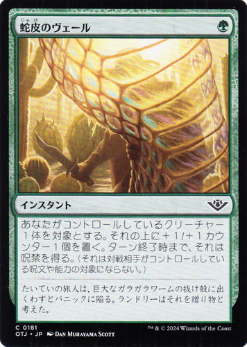 ![]() ![]() | OTJ 0181 蛇皮のヴェール インスタント サンダー・ジャンクションの無法者 C 色:緑 マナコスト:(緑) あなたがコントロールしているクリーチャー1体を対象とする。それの上に+1/+1カウンター1個を置く。ターン終了時まで、それは呪禁を得る。(それは対戦相手がコントロールしている呪文や能力の対象にならない。) たいていの旅人は、巨大なガラガラワームの抜け殻に出くわすとパニックに陥る。ランドリーはそれを贈り物と考えた。 illust:DAN MURAYAMA SCOTT |