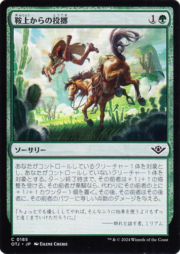 ![]() ![]() | OTJ 0185 鞍上からの投擲 ソーサリー サンダー・ジャンクションの無法者 C 色:緑 マナコスト:(1)(緑) あなたがコントロールしているクリーチャー1体を対象とし、あなたがコントロールしているクリーチャー1体を対象とする。ターン終了時まで、その前者は+1/+1の修整を受ける。その前者が乗騎なら、代わりにその前者の上に+1/+1カウンター1個を置く。その後、その前者はその後者に、その前者のパワーに等しい点数のダメージを与える。 「ちょっとでも優しくしてやれば、そんなふうに拍車を使うよりもずっと遠くまでいけただろうに。」 ――群れと話す者、ミリアム illust:EILENE CHERIE |