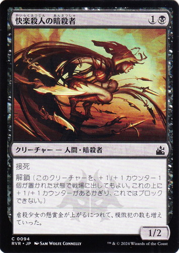 ![]() ![]() | RVR 0094 快楽殺人の暗殺者 クリーチャー ラヴニカ・リマスター C 色:黒 サブタイプ:人間・暗殺者 マナコスト:(1)(黒) パワー:1 タフネス:2 透かしシンボル:ラクドス 接死 解鎖(このクリーチャーを、+1/+1カウンター1個が置かれた状態で戦場に出してもよい。これの上に+1/+1カウンターがあるかぎり、これではブロックできない。) 虐殺少女の懸賞金が上がるにつれて、模倣犯の数も増えていった。 illust:SAM WOLFE CONNELLY |