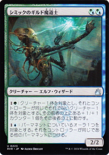 ![]() ![]() | RVR 0223 シミックのギルド魔道士 クリーチャー ラヴニカ・リマスター U 色:緑/青 サブタイプ:エルフ・ウィザード マナコスト:(緑/青)(緑/青) パワー:2 タフネス:2 透かしシンボル:シミック (1)(緑):クリーチャー1体を対象とし、それとコントローラーが同じでそれでないクリーチャー1体を対象とする。その前者の上にある+1/+1カウンター1個をその後者の上に動かす。 (1)(青):パーマネントについているオーラ1つを対象とする。それをコントローラーが同じである他のパーマネントにつける。 illust:ALEKSI BRICLOT |