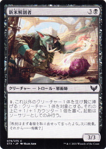 ![]() ![]() | MH3 0106 改良版人体改造機 アーティファクト・クリーチャー モダンホライゾン3 C 色:黒 サブタイプ:ゾンビ マナコスト:(黒) パワー:1 タフネス:1 (3)(黒):あなたの墓地にある改良版人体改造機をタップ状態かつ+1/+1カウンター2個が置かれた状態で戦場に戻す。 「やり直し!明日までに強化しておきなさい。」 ――アシュノッド illust:KEKAI KOTAKI |