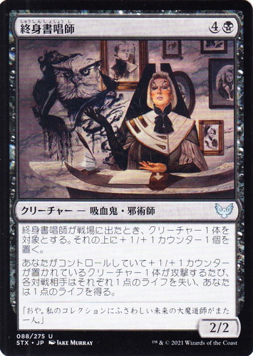 ![]() ![]() | RIX 078 霊廟のハーピー クリーチャー イクサランの相克 U 色:黒 サブタイプ:ハーピー マナコスト:(4)(黒) パワー:3 タフネス:3 飛行 昇殿(あなたがパーマネントを10個以上コントロールしているなら、このゲームの間、あなたは都市の承認を得る。) あなたがコントロールしている他のクリーチャーが1体死亡するたび、あなたが都市の承認を持っている場合、霊廟のハーピーの上に+1/+1カウンターを1個置く。 illust:RANDY VARGAS |