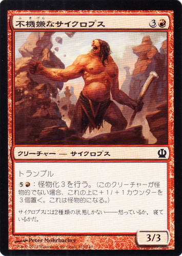 ![]() ![]() | THS 125 不機嫌なサイクロプス クリーチャー テーロス C 色:赤 サブタイプ:サイクロプス マナコスト:(3)(赤) パワー:3 タフネス:3 トランプル (5)(赤):怪物化3を行う。(このクリーチャーが怪物的でない場合、これの上に+1/+1カウンターを3個置く。これは怪物的になる。) サイクロプスには2種類の状態しかない――怒っているか、寝ているかだ。 illust:Peter Mohrbacher |