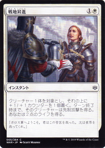 ![]() ![]() | WAR 005 戦地昇進 インスタント 灯争大戦 C 色:白 マナコスト:(1)(白) クリーチャー1体を対象とし、それの上に+1/+1カウンターを1個置く。ターン終了時まで、そのクリーチャーは先制攻撃を得る。あなたは2点のライフを得る。 「ボロス軍へようこそ。君はこの管区を救った。次は世界を救ってくれ。」 illust:SCOTT MURPHY |