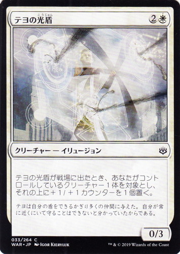 ![]() ![]() | WAR 033 テヨの光盾 クリーチャー 灯争大戦 C 色:白 サブタイプ:イリュージョン マナコスト:(2)(白) パワー:0 タフネス:3 テヨの光盾が戦場に出たとき、あなたがコントロールしているクリーチャー1体を対象とし、それに+1/+1カウンターを1個置く。 テヨは自分の盾をできるかぎり多くの仲間に与えた。自分が常に近くにいて守ることはできないと分かっていたからである。 illust:IGOR KIERYLUK |