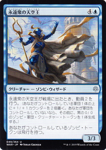 ![]() ![]() | WAR 049 永遠衆の天空王 クリーチャー 灯争大戦 U 色:青 サブタイプ:ゾンビ・ウィザード マナコスト:(4)(青) パワー:3 タフネス:3 永遠衆の天空王が戦場に出たとき、動員2を行う。(あなたがコントロールしている軍団1体に+1/+1カウンターを2個置く。あなたが軍団をコントロールしていないなら、その前に、黒の0/0のゾンビ・軍団・クリーチャー・トークンを1体生成する。) あなたがコントロールしているゾンビ・トークンは飛行を持つ。 illust:JOHAN GRENIER |