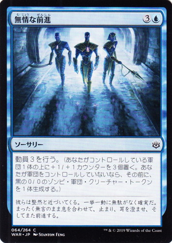 ![]() ![]() | WAR 064 無情な前進 ソーサリー 灯争大戦 C 色:青 マナコスト:(3)(青) 動員3を行う。(あなたがコントロールしている軍団1体に+1/+1カウンターを3個置く。あなたが軍団をコントロールしていないなら、その前に、黒の0/0のゾンビ・軍団・クリーチャー・トークンを1体生成する。) 彼らは整然と近づいてくる。一挙一動に無駄がなく確実だ。まったく無言のまま息を合わせて、止まり、耳を澄ませ、そしてまた前進する。 illust:STANTON FENG |