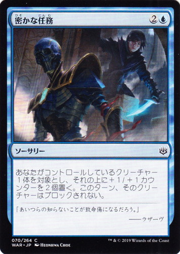 ![]() ![]() | WAR 070 密かな任務 ソーサリー 灯争大戦 C 色:青 マナコスト:(2)(青) あなたがコントロールしているクリーチャー1体を対象とし、それの上に+1/+1カウンターを2個置く。このターン、そのクリーチャーはブロックされない。 「あいつらの知らないことが致命傷になるだろう。」 ――ラサーヴ illust:HEONHWA CHOE |