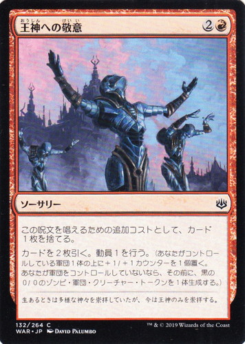 ![]() ![]() | WAR 132 王神への経緯 ソーサリー 灯争大戦 C 色:赤 マナコスト:(2)(赤) この呪文を唱えるための追加コストとして、カード1枚を捨てる。 カード2枚を引く。動員1を行う。(あなたがコントロールしている軍団1体に+1/+1カウンターを1個置く。あなたが軍団をコントロールしていないなら、その前に、黒の0/0のゾンビ・軍団・クリーチャー・トークンを1体生成する。) 生あるときは多様な神々を崇拝していたが、今は王神のみを崇拝する。 illust:DAVID PALUMBO |