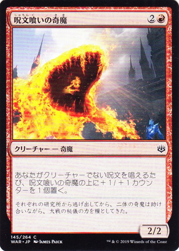 ![]() ![]() | WAR 145 呪文喰いの奇魔 クリーチャー 灯争大戦 C 色:赤 サブタイプ:奇魔 マナコスト:(2)(赤) パワー:2 タフネス:2 あなたがクリーチャーでない呪文を唱えるたび、呪文喰いの奇魔の上に+1/+1カウンターを1個置く。 それぞれの研究所から逃げ出してから、ニ体の奇魔は助け合いながら、大戦の秘儀の力を糧としてきた。 illust:JAMES PAICK |