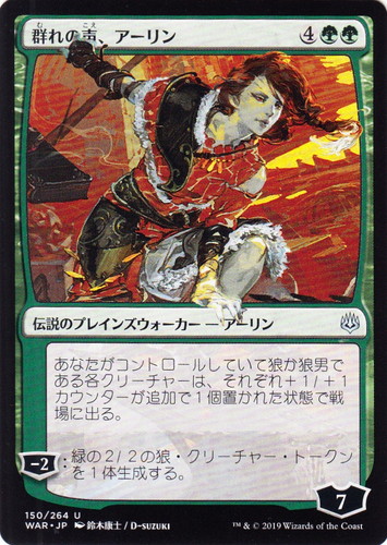 ![]() ![]() | WAR 150 群れの声、アーリン 伝説のプレインズウォーカー 灯争大戦 U(アート) 色:緑 サブタイプ:アーリン マナコスト:(4)(緑)(緑) 忠誠値:7 あなたがコントロールしていて狼か狼男である各クリーチャーは、それぞれ+1/+1カウンターが追加で1個置かれた状態で戦場に出る。 [-2]:緑の2/2の狼・クリーチャー・トークンを1体生成する。 illust:鈴木康士/D-SUZUKI |
