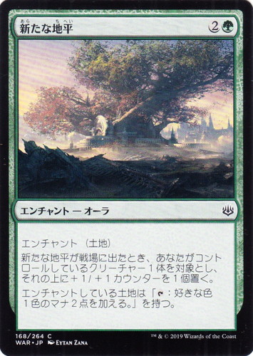 ![]() ![]() | WAR 168 新たな地平 エンチャント 灯争大戦 C 色:緑 サブタイプ:オーラ マナコスト:(2)(緑) エンチャント(土地) 新たな地平が戦場に出たとき、あなたがコントロールしているクリーチャー1体を対象とし、それの上に+1/+1カウンターを1個置く。 エンチャントしている土地は「[T]:好きな色1色のマナ2点を加える。」を持つ。 illust:EYTAN ZANA |
