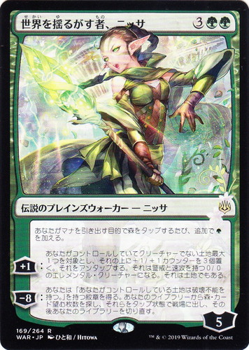 ![]() ![]() | WAR 169 世界を揺るがす者、ニッサ 伝説のプレインズウォーカー 灯争大戦 R(アート) 色:緑 サブタイプ:ニッサ マナコスト:(3)(緑)(緑) 忠誠値:5 あなたがマナを引き出す目的で森をタップするたび、追加で(緑)を加える。 [+1]:あなたがコントロールしていてクリーチャーでない土地最大1つを対象とし、それの上に+1/+1カウンターを3個置く。それをアンタップする。それは警戒と速攻を持つ0/0のエレメンタル・クリーチャーになる。それは土地でもある。 [-8]:あなたは「あなたがコントロールしている土地は破壊不能を持つ。」を持つ紋章を得る。あなたのライブラリーから森・カード望む枚数を探し、それらをタップ状態で戦場に出し、その後あなたのライブラリーを切り直す。 illust:ひと和/HITOWA |