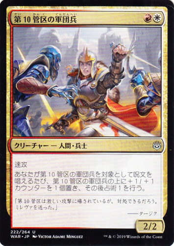 ![]() ![]() | WAR 222 第10管区の軍団兵 クリーチャー 灯争大戦 U 色:赤/白 サブタイプ:人間・兵士 マナコスト:(赤)(白) パワー:2 タフネス:2 速攻 あなたが第10管区の軍団兵を対象として呪文を唱えるたび、第10管区の軍団兵の上に+1/+1カウンターを1個置き、その後占術1を行う。 「第10管区は激しい攻撃に曝されているが、対処できるだろう。ミレヴァを送った。」 ――タージク illust:VICTOR ADAME MINGUEZ |