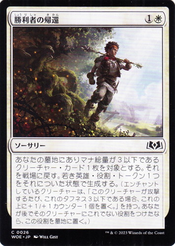 ![]() ![]() | WOE 0026 勝利者の帰還 ソーサリー エルドレインの森 C 色:白 マナコスト:(1)(白) あなたの墓地にありマナ総量が3以下であるクリーチャー・カード1枚を対象とする。それを戦場に戻す。若き英雄・役割・トークン1つをそれについた状態で生成する。(エンチャントしているクリーチャーは、「このクリーチャーが攻撃するたび、これのタフネス3以下である場合、これの上に+1/+1カウンター1個を置く。」を持つ。あなたが後でそのクリーチャーにこれでない役割をつけたなら、この役割を墓地に置く。) illust:WILL GIST |