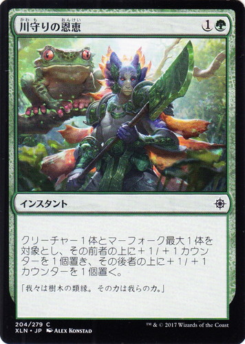 ![]() ![]() | XLN 204 川守りの恩恵 インスタント イクサラン C 色:緑 マナコスト:(1)(緑) クリーチャー1体とマーフォーク最大1体を対象とし、その前者に上に+1/+1カウンターを1個置き、その後者に+1/+1カウンターを1個置く。 「我々は樹木の類縁。その力は我らの力。」 illust:ALEX KONSTAD |