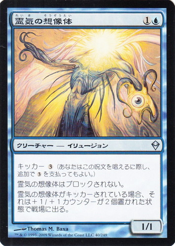 ![]() ![]() | ZEN 040 霊気の想像体 クリーチャー ゼンディカー U 色:青 サブタイプ:イリュージョン マナコスト:(1)(青) パワー:1 タフネス:1 キッカー(3)(あなたはこの呪文を唱えるに際し、追加で(3)を支払ってもよい。) 霊気の想像体はブロックされない。 霊気の想像体がキッカーされている場合、それは+1/+1カウンターが2個置かれた状態で戦場に出る。 illust:Thomas M. Baxa |