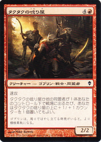 ![]() ![]() | ZEN 152 タクタクの唸り屋 クリーチャー ゼンディカー C 色:赤 サブタイプ:ゴブリン・戦士・同盟者 マナコスト:(4)(赤) パワー:2 タフネス:2 タクタクの唸り屋か他の同盟者が1体あなたのコントロール下で戦場に出るたび、あなたはタクタクの唸り屋の上に+1/+1カウンターを1個置いてもよい。 ゴブリンは、周りではやし立てる群衆がいると、より積極果敢になる。 illust:Mike Bierek |