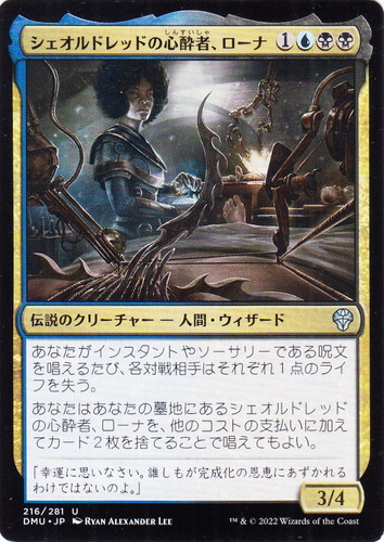 ![]() ![]() | DMU 216 シェオルドレッドの心酔者、ローナ 伝説のクリーチャー 団結のドミナリア U 色:青/黒 サブタイプ:人間・ウィザード マナコスト:(1)(青)(黒)(黒) パワー:3 タフネス:4 あなたがインスタントやソーサリーである呪文を唱えるたび、各対戦相手はそれぞれ1点のライフを失う。 あなたはあなたの墓地にあるシェオルドレッドの心酔者、ローナを、他のコストに加えてカード2枚を捨てることで唱えてもよい。 「幸運に思いなさい。誰しもが完成化の恩恵にあずかれるわけではないのよ。」 illust:RYAN ALEXANDER LEE |