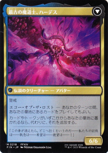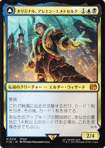 ![]() ![]() | FIN 0218 オリジナル、アシエン・エメトセルク 伝説のクリーチャー FINAL FANTASY M 色:青/黒 サブタイプ:エルダー・ウィザード マナコスト:(1)(青)(黒) パワー:2 タフネス:4 警戒 これが戦場に出るか攻撃するたび、カード1枚を引き、その後、カード1枚を捨てる。 あなたのアップキープの開始時に、あなたの墓地に14枚以上のカードがある場合、これを変身させてもよい。 両面:最古の魔道士、ハーデス illust:NESTOR OSSANDON LEAL 出典:FFXIV |