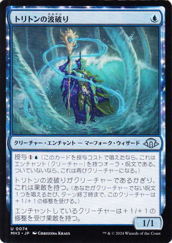 ![]() ![]() | MH3 0074 トリトンの波破り クリーチャー・エンチャント モダンホライゾン3 U 色:青 サブタイプ:マーフォーク・ウィザード マナコスト:(青) パワー:1 タフネス:1 授与(1)(青)(このカードを授与コストで唱えたなら、これはエンチャント(クリーチャー)を持つオーラ・呪文である。ついてないなら、これは再びクリーチャーになる。) トリトンの波破りがクリーチャーであるかぎり、これは果敢を持つ。(あなたがクリーチャーでない呪文1つを唱えるたび、ターン終了時まで、このクリーチャーは+1/+1の修整を受ける。) エンチャントしているクリーチャーは+1/+1の修整を受け果敢を持つ。 illust:CHRISTINA KRAUS |