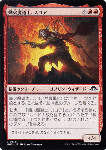 ![]() ![]() | MH3 0138 熾火魔道士、スコア 伝説のクリーチャー モダンホライゾン3 C 色:赤 サブタイプ:ゴブリン・ウィザード マナコスト:(4)(赤)(赤) パワー:4 タフネス:4 熾火魔道士、スコアが戦場に出たとき、1つを対象とする。これはそれに4点のダメージを与える。 壮大―「熾火魔道士、スコア」という名前を持ち、これでないカード1枚を捨てる, 山2つを生け贄に捧げる:1つを対象とする。これはそれに4点のダメージを与える。 「焚き付けが必要だ。君ならうまくできる。」 illust:KEVIN SIDHARTA |