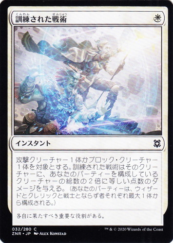 ![]() ![]() | ZNR 032 訓練された戦術 インスタント ゼンディカーの夜明け C 色:白 マナコスト:(白) 攻撃クリーチャー1体かブロック・クリーチャー1体を対象とする。訓練された戦術はそのクリーチャーに、あなたのパーティーを構成しているクリーチャーの総数の2倍に等しい点数のダメージを与える。(あなたのパーティーは、ウィザードとクレリックと戦士とならず者それぞれ最大1体から構成される。) 各自に果たすべき重要な役割がある。 illust:ALEX KONSTAD |