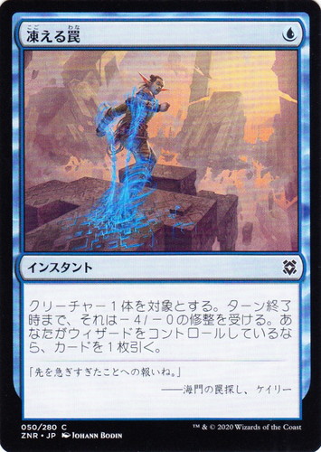 ![]() ![]() | ZNR 050 凍える罠 インスタント ゼンディカーの夜明け C 色:青 マナコスト:(青) クリーチャー1体を対象とする。ターン終了時まで、それは-4/-0の修整を受ける。あなたがウィザードをコントロールしているなら、カードを1枚引く。 「先を急ぎすぎたことへの報いね。」 ――海門の罠探し、ケイリー illust:JOHANN BODIN |