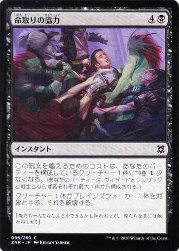![]() ![]() | ZNR 096 命取りの協力 インスタント ゼンディカーの夜明け C 色:黒 マナコスト:(4)(黒) この呪文を唱えるためのコストは、あなたのパーティーを構成しているクリーチャー1体につき(1)少なくなる。(あなたのパーティーは、ウィザードとクレリックと戦士とならず者それぞれ最大1体から構成される。) クリーチャー1体かプレインズウォーカー1体を対象とする。それを破壊する。 「俺たち一人ならなんとかできるかも知れねぇが、俺たち全員には敵わねぇぜ!」 illust:KIERAN YANNER |
