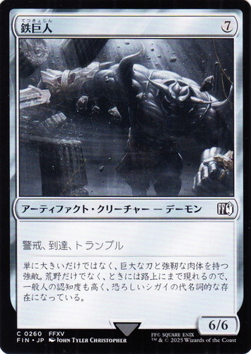 ![]() ![]() | FIN 0260 鉄巨人 アーティファクト・クリーチャー FINAL FANTASY C 色:無色 サブタイプ:デーモン マナコスト:(7) パワー:6 タフネス:6 警戒、到達、トランプル 単に大きいだけではなく、巨大な刀と強靭な肉体を持つ強敵。荒野だけでなく、ときには路上にまで現れるので、一般人の認知度も高く、恐ろしいシガイの代名詞的な存在になっている。 illust:JOHN TYLER CHRISTOPHER 出典:FFXV |