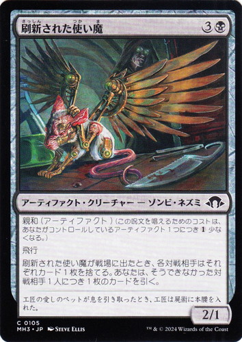 ![]() ![]() | MH3 0105 刷新された使い魔 アーティファクト・クリーチャー モダンホライゾン3 C 色:黒 サブタイプ:ゾンビ・ネズミ マナコスト:(3)(黒) パワー:2 タフネス:1 親和(アーティファクト)(この呪文を唱えるためのコストは、あなたがコントロールしているアーティファクト1つにつき(1)少なくなる。) 飛行 刷新された使い魔が戦場に出たとき、各対戦相手はそれぞれカード1枚を捨てる。あなたは、そうできなかった対戦相手1人につき1枚のカードを引く。 工匠の愛しのペットが息を引き取ったとき、工匠は屍術に本腰を入れた。 illust:STEVE ELLIS |